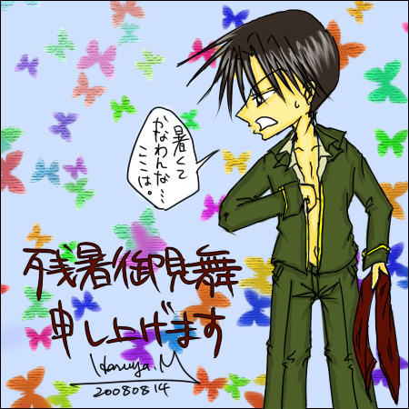 ▲残暑お見舞いイラを作成してみたのですが、色気も何もあったもんじゃなくてむしろ変質者と罵られそうな――大佐がちょっとだけ肌蹴てたりする一品。エロさも色気もないが変態くささはあるかもしれません(^p^)