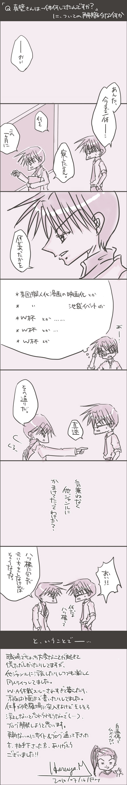 とりあえず仕事はこれから修羅場期間に入るので更新の見込みは低いですが、7月があの国擬人化漫画的に誕生日ラッシュで同人屋泣かせだったのに対し、8月は8月で旧館の開設記念日があったり新館も開設記念日だったりで管理人泣かせな月なのでとりあえずブログの更新休止だけ解除します。戻ってくるという宣言とはまた微妙な溝のある選択。