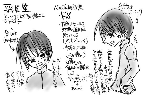 そんで、髪型は「刈り込んでいない素直な髪」という記述しか見付からなかったのでこう…大佐が秋彦の身代わりとして用意したコマだから秋彦っぽい具合にならんかのうと考えながら描いてみたのですが、真壁の描く秋彦と菊(@ヘタ)とゼロイチを足して3で割るとこんなかんじになるんじゃね? みたいな感じになりました。いい加減手持ちのキャラが増えて描きわけができてないのが露呈されてしまったかんじですね残念なかんじです。
