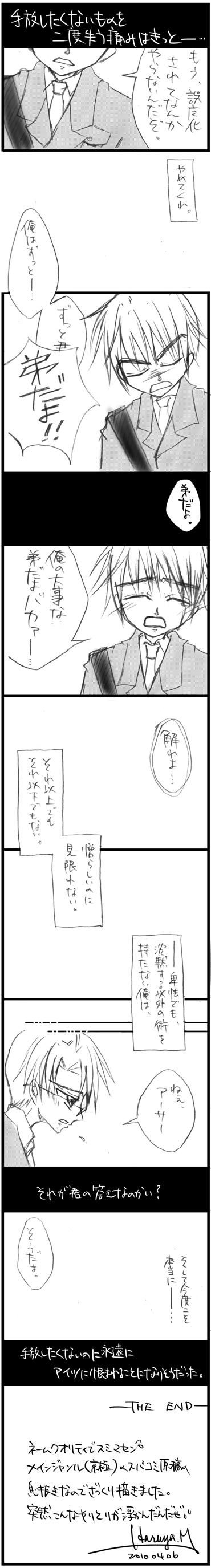 短いけど…断ち切りB5原稿用紙で1枚強はあるだからそんなに短くもないんだぜ…先日の四月馬鹿漫画の1/3ですけどね。今回はちゃんと影入れまでしたんだぜ☆